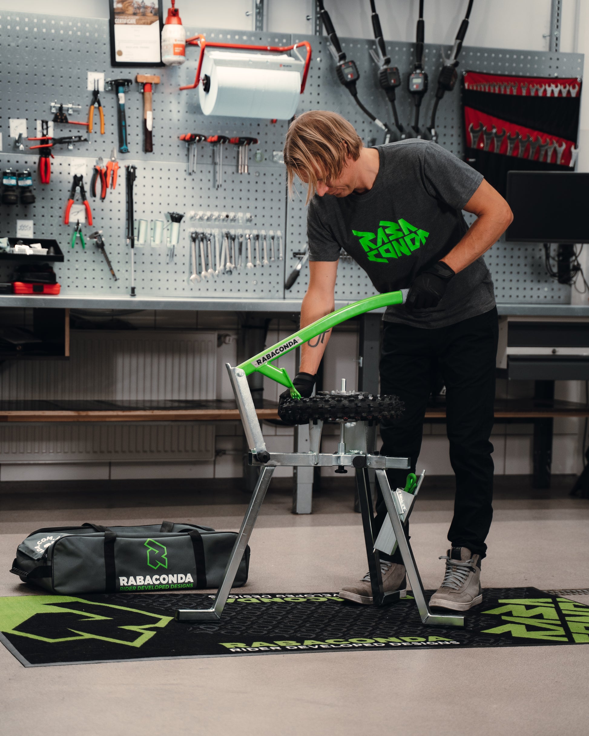 Changer, a tool loved by thousands of professional racers, mechanics, and weekend warriors, the Rabaconda Mini Tire Changer is made to quickly and easily change motorcycle tires from 10”-17”, which are often some of the most difficult tires to change.